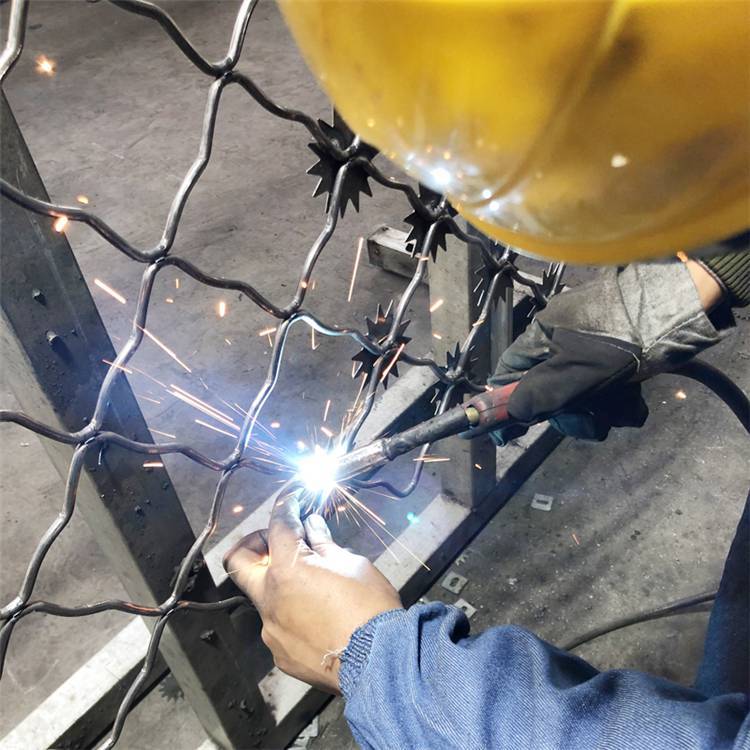1、太陽花刺片:太陽花刺片直徑一般不小于7.5cm (直徑6cm、7cm、8cm) , 刺片厚1.5mm,采用Q235低碳鋼板沖壓成型。太陽花剌片用氬弧焊將太陽花形刺片焊接在美格網(wǎng)的節(jié)點上,形成刺形保護,有效的防止了手握腳攀。